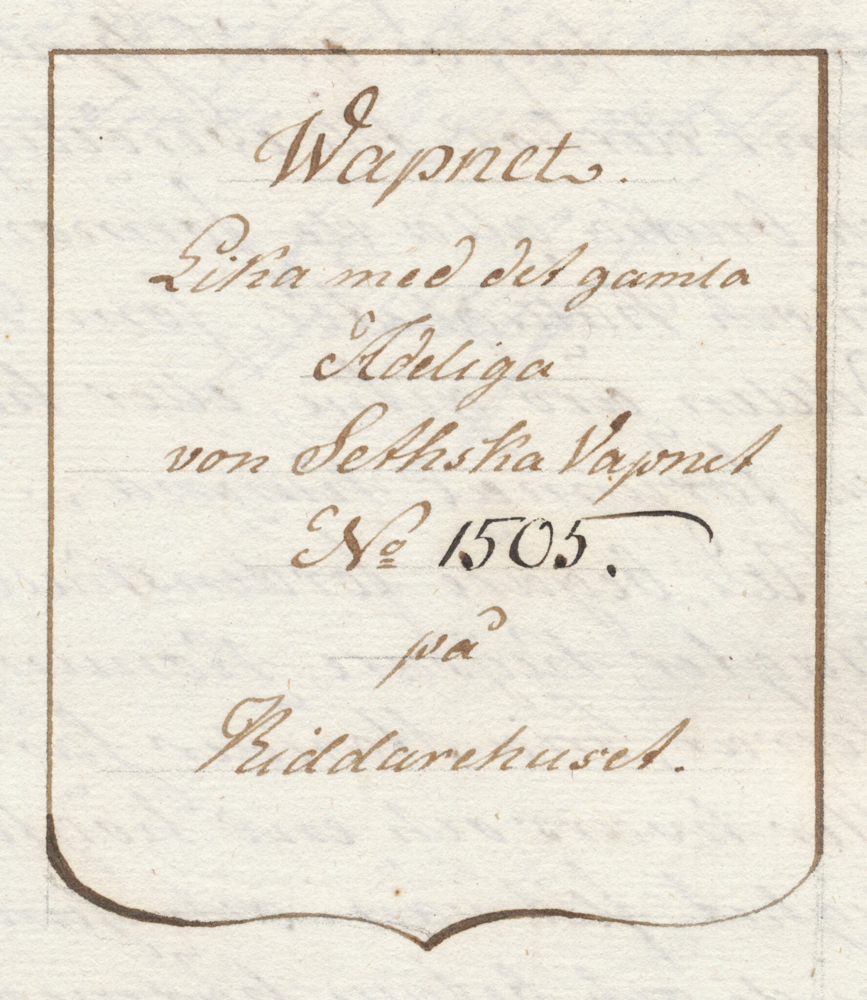 Sköldebrevet i avskrift för adliga ätten von Seth, nr 1505.