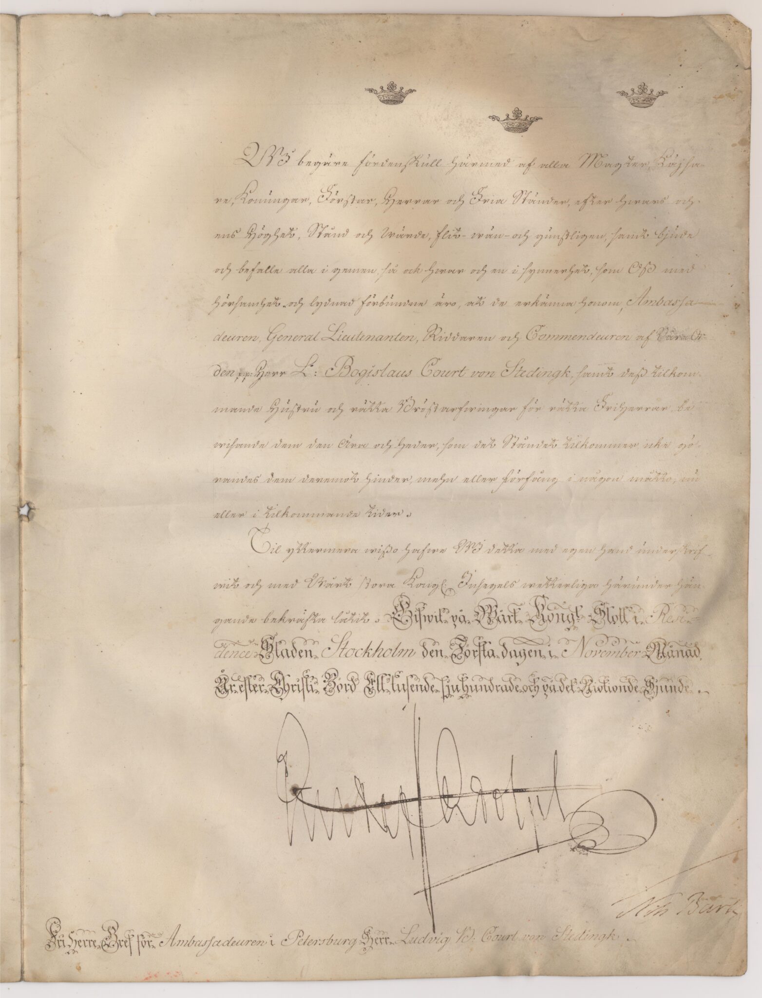 Friherrebrevet i original för friherrliga ätten von Stedingk, nr 316.