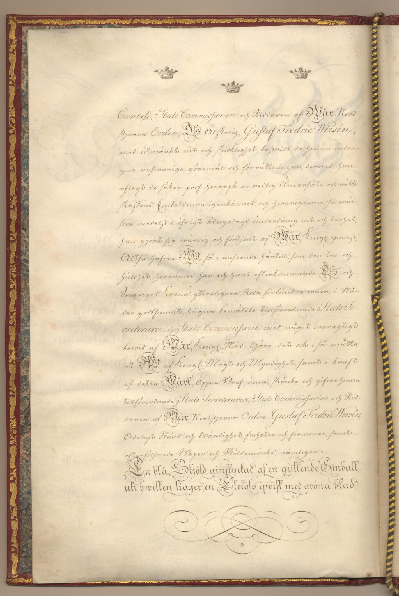 Sköldebrevet i original för utdöda adliga ätten Wirsén, nr 2222.