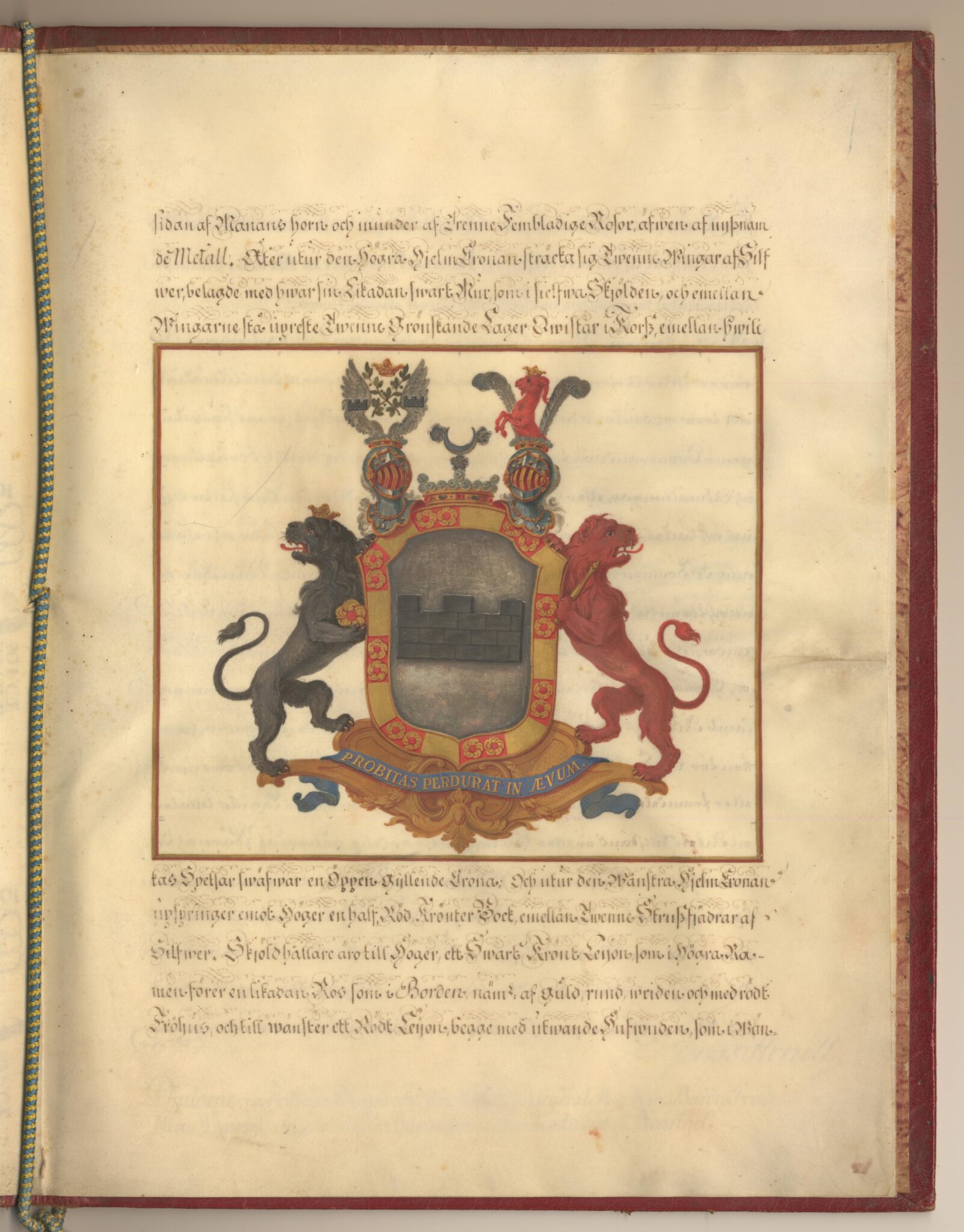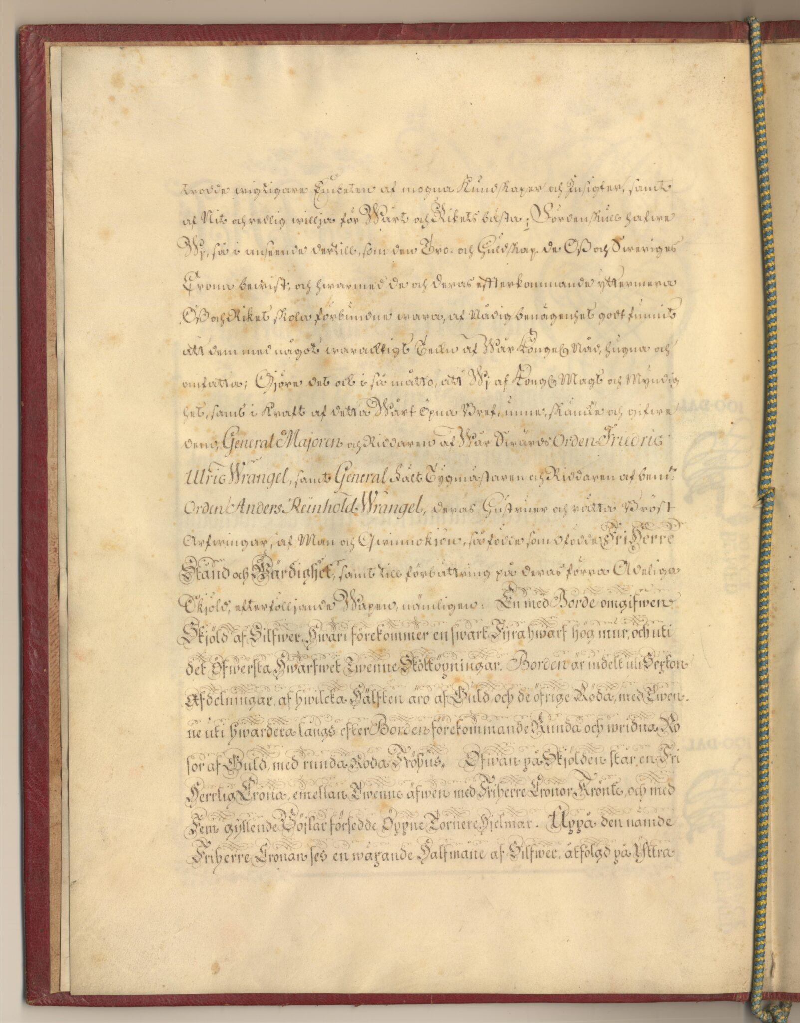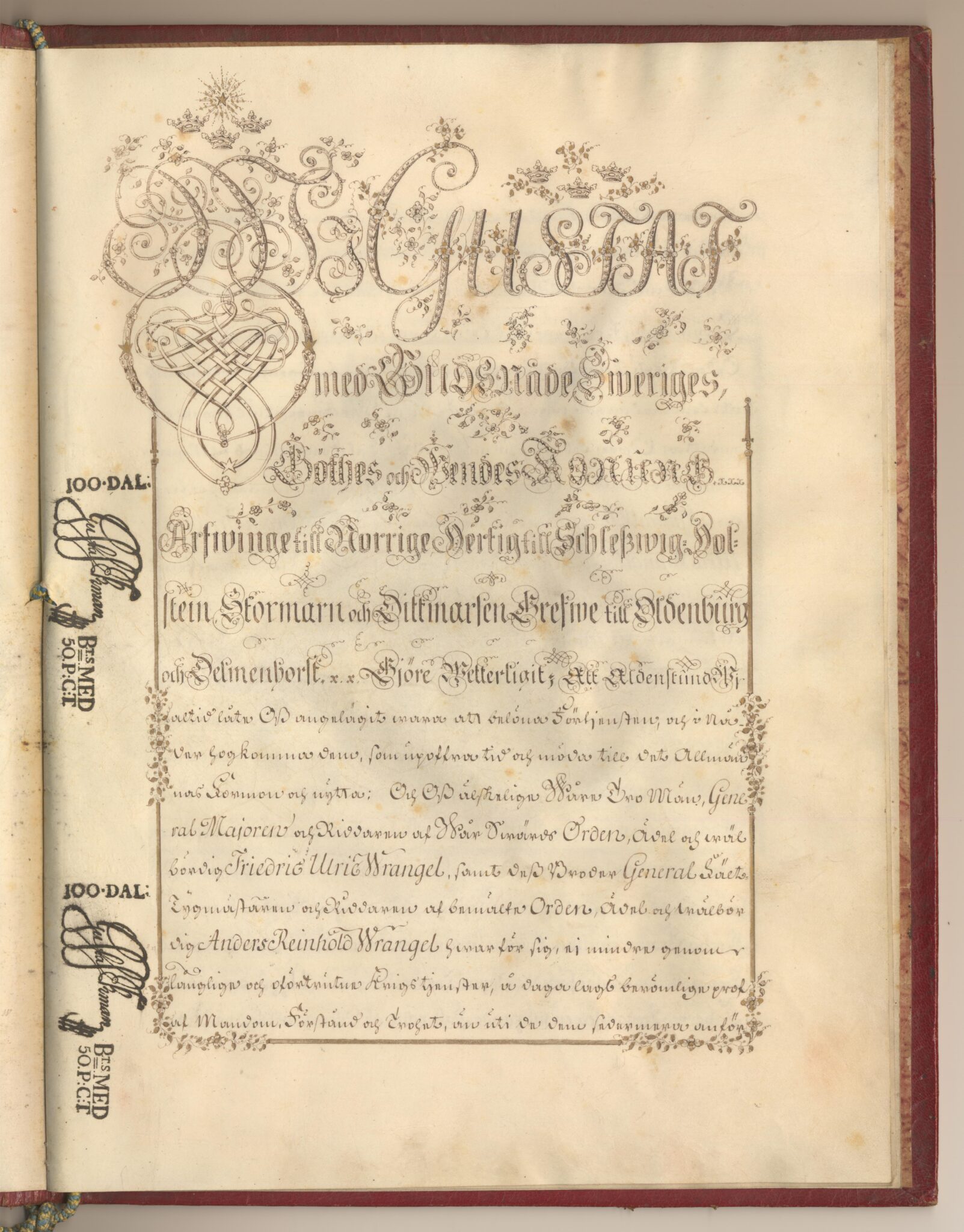 Friherrebrevet i original för friherrliga ätten Wrangel af Sauss, nr 279.